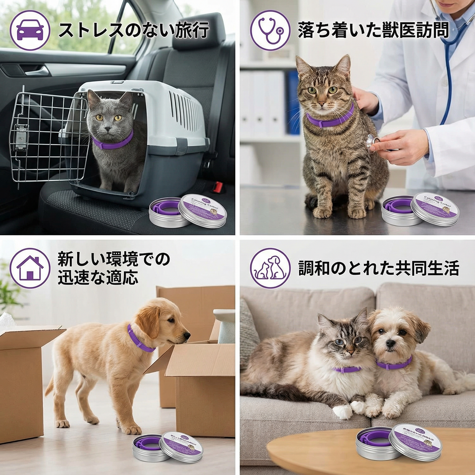 猫は繊細な動物で、特に変化や環境の変化に敏感です。フェロモンリラックス首輪は、愛猫が不安やストレスを感じたときに、自然な方法で心を落ち着ける手助けをします。旅行や引っ越し、病院への訪問などのストレスが大きい場面でも、猫を穏やかに保つことができるため、飼い主も安心です。